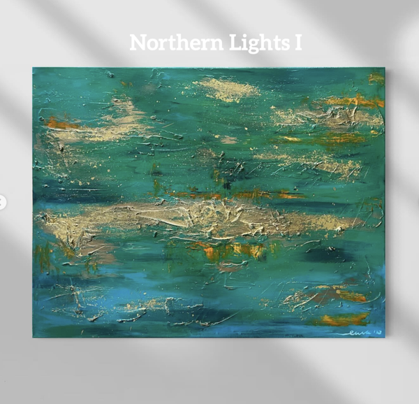 Een mystiek groen schilderij die het noorderlicht vastlegt. Het diepe, rijke groen domineert het doek, waarbij de groene tinten subtiel variëren. Hierdoor ontstaat de illusie van golvende lichten die zich zachtjes door de lucht bewegen. De gouden accenten op het schilderij, staan als flikkerende sterren aan de hemel. Het geheel straalt een serene schoonheid uit, waarbij de combinatie van groen en goud een mooi samenspel vormt.