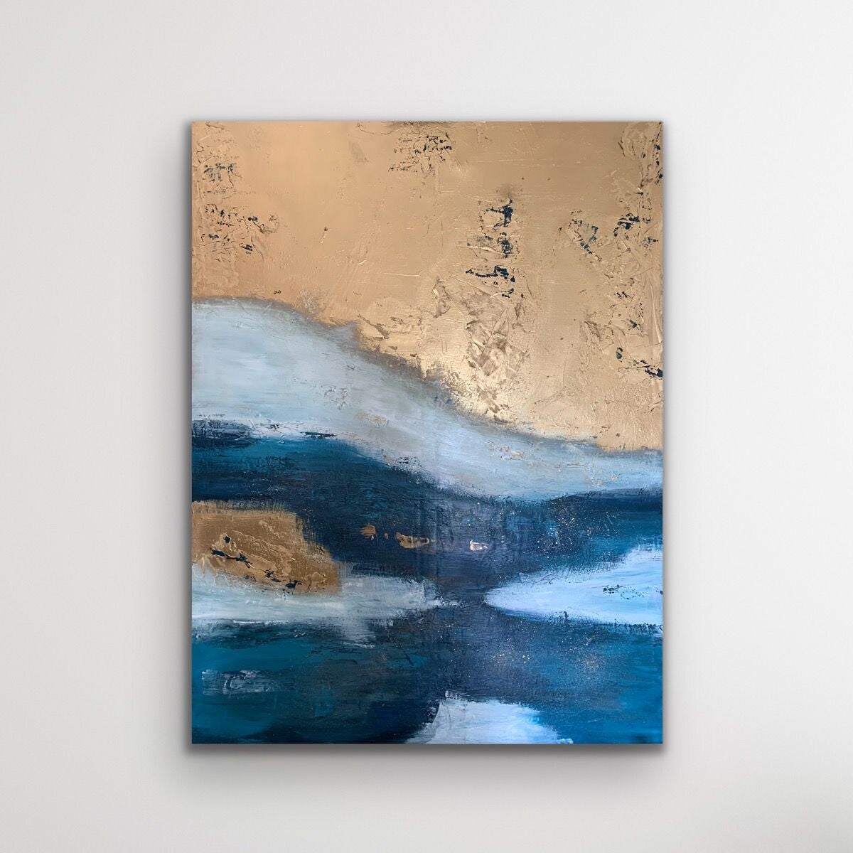 Abstract schilderij, gebaseerd op de Nederlandse branding: de wilde golven, het mooie goude zandstrand en de typisch Nederlandse duinen die een mooi geheel vormen.